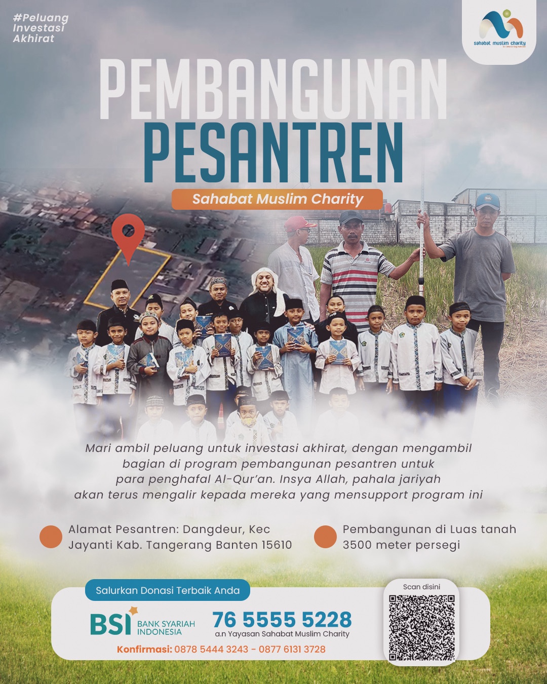 Mari ambil bagian dalam program pembangunan pesantren bersama Sahabat Muslim Charity, sebuah inisiatif mulia untuk mewujudkan tempat belajar dan menghafal Al-Qur’an bagi generasi muda Islam. Melalui program ini, setiap kontribusi yang Anda berikan menjadi bagian dari investasi akhirat yang pahalanya akan terus mengalir, bahkan setelah kita tiada.